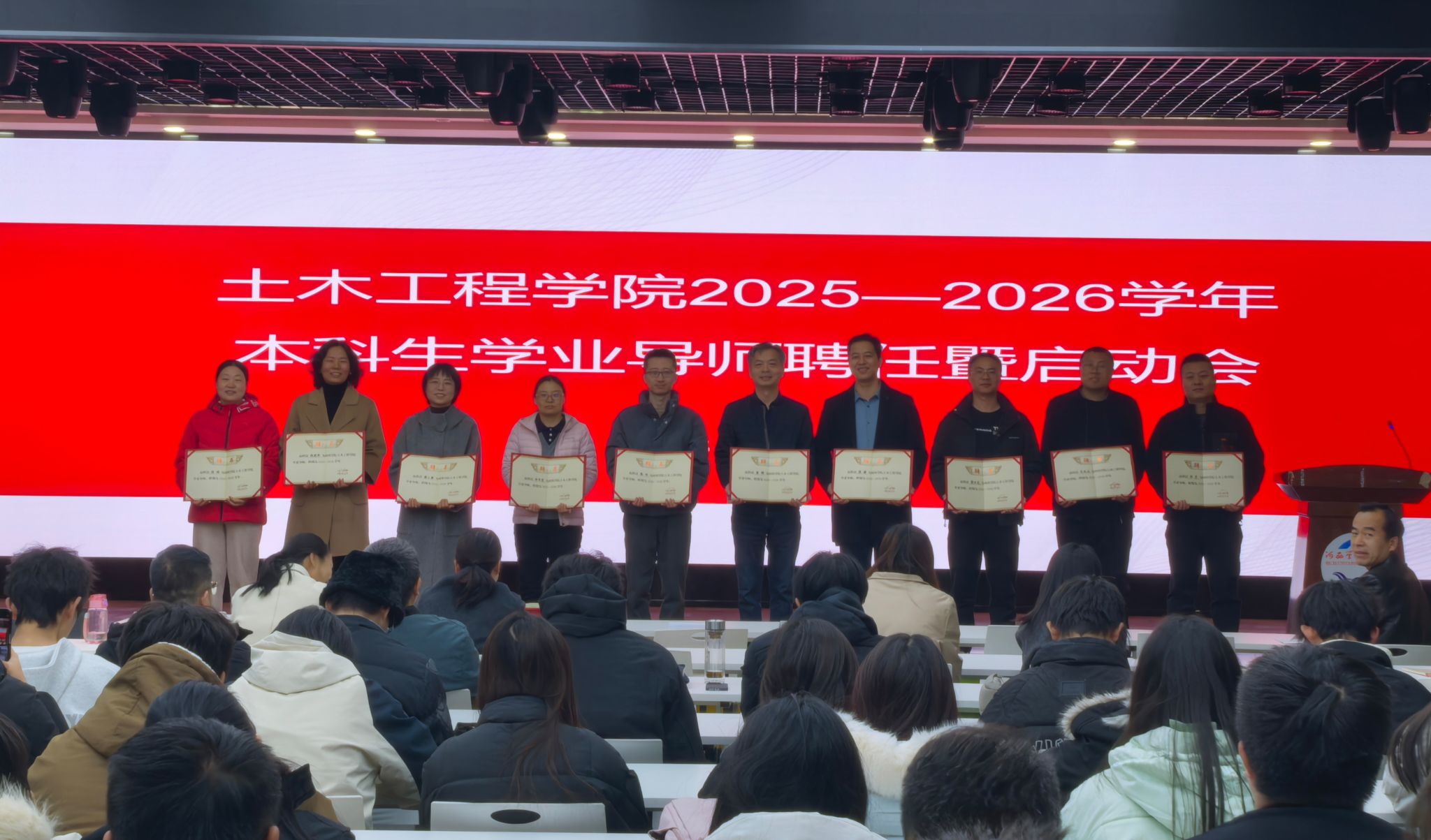 会上,学院负责人代表学院向受聘导师表示祝贺,并强调一纸聘书,一份重任,全体导师要牢记育人使命,做学生成长的引路人,积极构建全员、全过程、全方位的育人良好生态,助力学生成长成才。