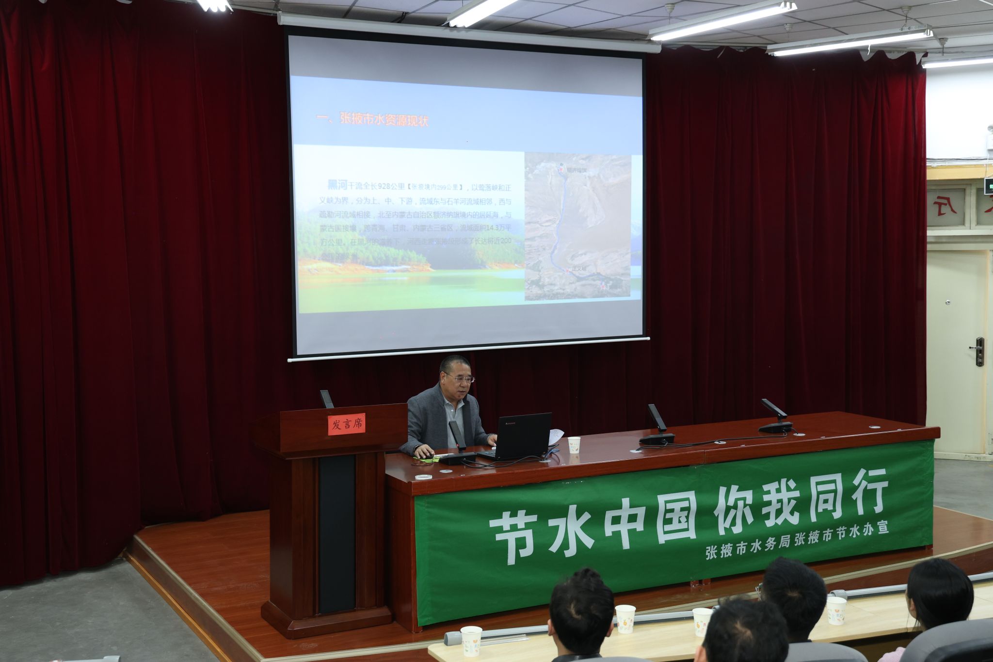 报告中,杨宏以《张掖市水资源利用现状及建设节水型社会新标杆的思路》为题,围绕张掖市水资源现状、节约用水的重大意义、节水工作取得的成效、张掖水资源开发利用存在的主要问题、建设节水型社会新标杆主要做法、水肥一体化技术六个方面,结合张掖市建设节水型社会新标杆的主要做法,系统阐述了张掖市作为河西走廊生态屏障核心区,在维系黑河湿地生态中发挥的重要作用。他指出,节水工作既是区域责任,更是国家战略需求,高校师生要发挥专业优势,积极参与节水技术研发与科普宣传,为构建节水型社会贡献力量。